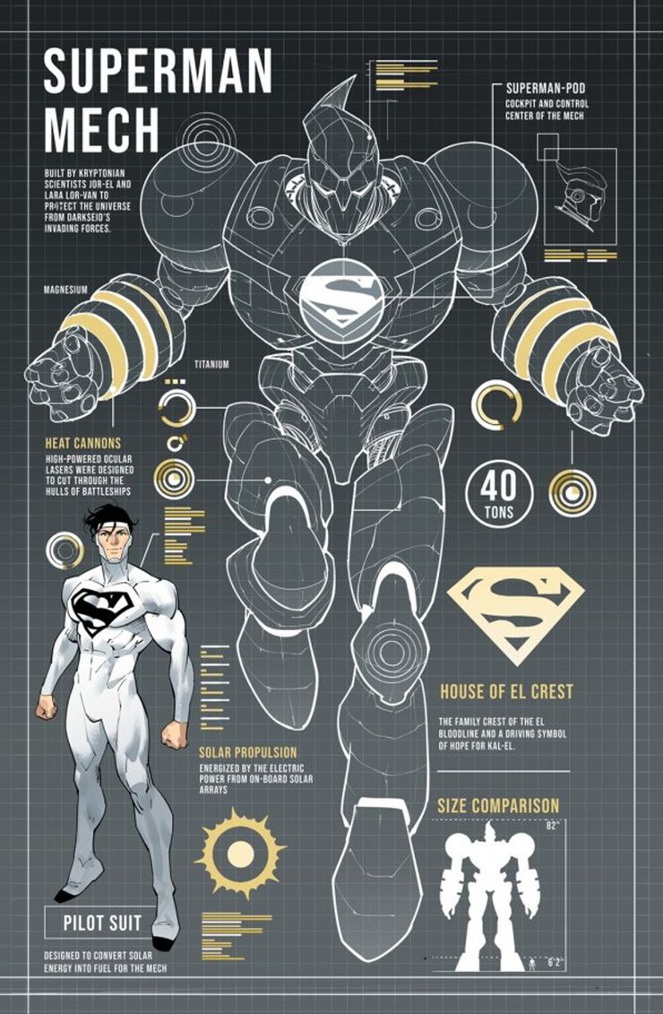 Construido con magnesio y titanio como algunos de sus materiales principales, este mecanismo de 40 toneladas es una obra de ingeniería kryptoniana. Jor-El, el padre de Superman, es conocido por su inteligencia y por salvar a su hijo de la desaparición de Krypton junto con la madre de Clark, Lara Lor-Van. Sin embargo, esta serie agregará un nuevo logro a su lista: construir un robot imponente para combatir a Darkseid. El robot incorpora el símbolo tradicional de Superman, lo que significa más que nunca, dado que sus poderes estarán aún más ligados a su origen, y canaliza el diseño kryptoniano sobre su esquema de color cómico tradicional. De blanco, se parece mucho a los trajes con los que a menudo se representa a Jor-El, además de ser un traje solar similar al que usa Super Boy en Justicia Jóven.