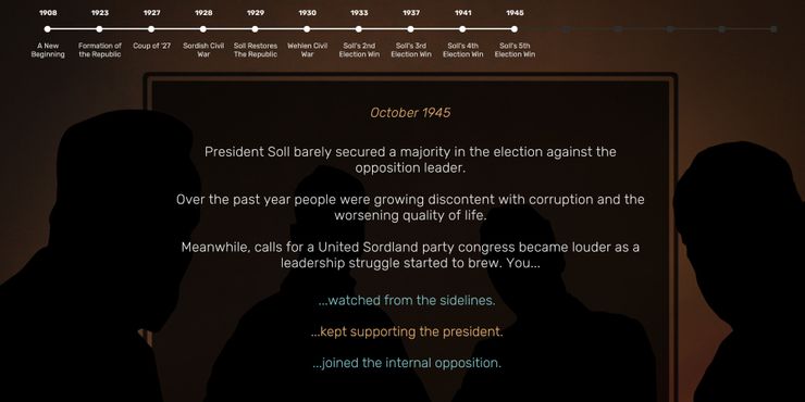 Las opciones en el juego implican financiar al gobierno, lidiar con amenazas internas y externas y necesidades internas y externas. Sordland es el hogar de dos grandes grupos minoritarios que viven en las tierras limítrofes con dos vecinos de Sordland, cada uno con sus propios intereses. Los ministros del gabinete también tienen diferentes opiniones sobre lo que es bueno para Sordland, y los líderes de toda la región y el mundo exigen consideración. Sin embargo, antes de que el jugador se meta en nada de esto, la juventud de Anton, a través de las decisiones tomadas en el prólogo, puede tener un impacto en todo lo que está por venir.
