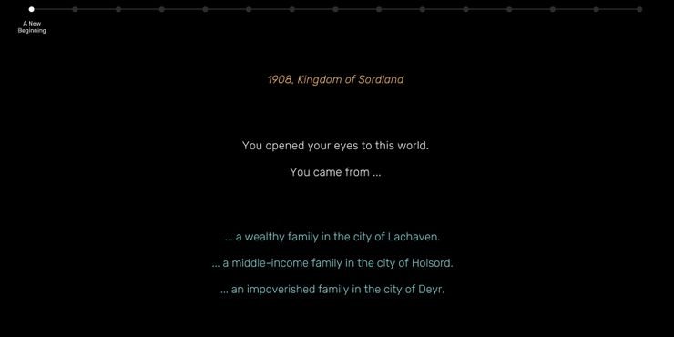 Las decisiones tomadas en el primer capítulo ayudan a determinar lo que los políticos y la gente común esperarán de la administración de Anton Rayne en un juego que no rehuye lidiar con un panorama político. Provenir de una familia de bajos ingresos en Deyr, por ejemplo, ayuda a las encuestas de opinión en Bergia, la región rural circundante que alberga a la mayoría de la minoría Bludish. Provenir de una familia rica en la potencia económica de Lachaven hace que sea menos probable que a la gente le guste Rayne desde el principio, pero comenzará con más riqueza personal para oportunidades de inversión importantes.