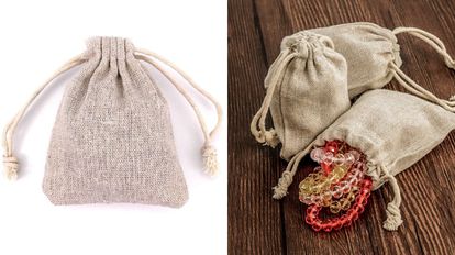 Una forma eficaz de evitar arañazos y mantener el brillo natural de nuestras joyas durante más tiempo es hacernos con un producto como la de la imagen. Se trata de un pack de medio centenar de bolsas con una apertura y cierre muy cómodos (mediante un simple cordón), fabricadas en lino natural y algodón. Estos materiales aportan una mayor durabilidad al tejido. Se venden también en tallas más grandes.