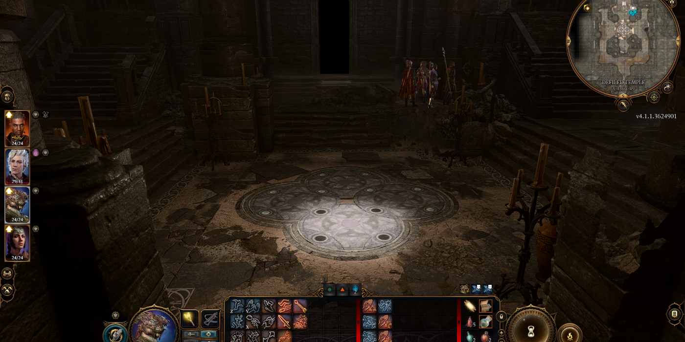 Navega por los pasillos para descubrir una habitación con cuatro círculos giratorios en el suelo, marcados por varios espacios llenos y vacíos. resuelve el rompecabezas de la Luna del Templo Profanado en Puerta de Baldur 3 para acceder a la siguiente habitación y descender a la Infraoscuridad, que conduce directamente al puesto avanzado selunita.