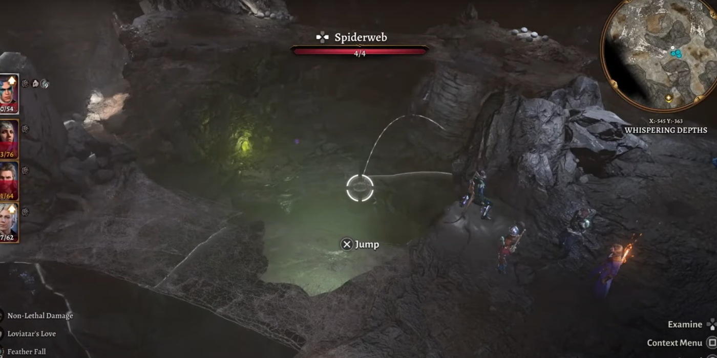 Para descender con seguridad, lanzar Feather Falling (a través de un pergamino si es necesario), evitando la muerte por daño de caída para tu grupo. Al aterrizar, encontrarás el cadáver de la araña disponible para saquear. Para acercarte sigilosamente, permanece fuera de la vista detrás de las rocas o usa la invisibilidad para evitar el combate, esperando a que la araña se posicione en las redes sobre el abismo.