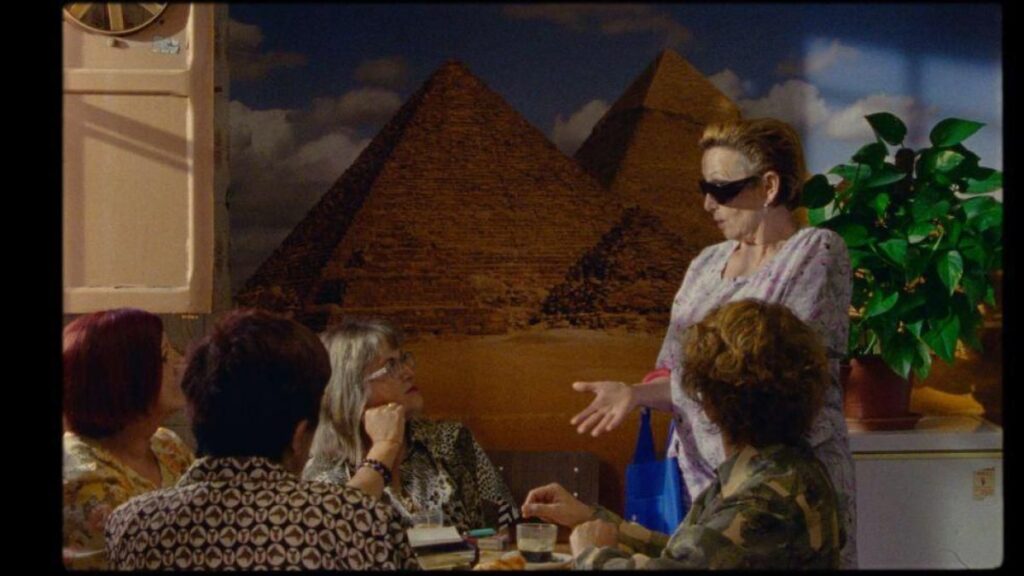 El gotelé en las paredes está también en Espíritu sagrado. “Sé cómo son las casas de Elche. Trabajé en una empresa de seguros y yo iba cobrando los muertos, una expresión muy alicantina para llamar a los seguros de defunción. Las casas del Carrús son así”. Díaz se refiere al barrio obrero de su ciudad, donde la mayoría de sus vecinos trabaja en la industria del calzado. Las mujeres son aparadoras, hacen zapatos en casas y no en las fábricas. “Tuvimos problemas, porque la mayoría de aparadoras trabajan en negro y no querían mostrar sus casas. Al final, me traje una máquina de aparado [como las de coser] y la pusimos en el salón mirando a la tele. Toda la vida he visto a mis vecinas aparando mientras veían la tele a las once de la noche. Era una manera de reivindicar el trabajo de aparadora, que si estuviera bien pagado sería bien bonito”.