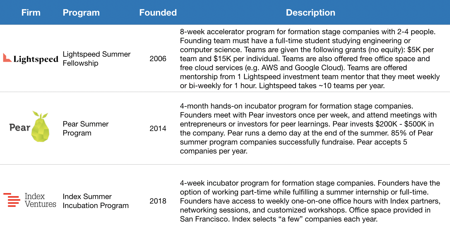 Más allá del Fondo del dormitorio y Rough Draft Ventures, algunas firmas de capital de riesgo se enfocan en la incubación de empresas nuevas fundadas por estudiantes. Primero se debe dar crédito a Lightspeed para producir la increíble experiencia de campamentos de Summer Fellows para los estudiantes fundadores prometedores: ¡después de todo, Pinterest se construyó allí! Jeremy Liew ofrece una buena visión general del programa a través de su entrevista con Zack Banack de Afterbox. Según un estudio que realizaron el año pasado, el 40% de los ex alumnos de Lightspeed Summer Fellows son actualmente fundadores activos. Pear Ventures también tiene un impresionante programa de incubadora de verano donde el 85% de sus compañías completan con éxito una recaudación de fondos. Index Ventures es el último en crear un programa de incubadora para estudiantes fundadores e incluso acepta fundadores que quieran trabajar en una idea a tiempo parcial mientras completan una pasantía de verano.