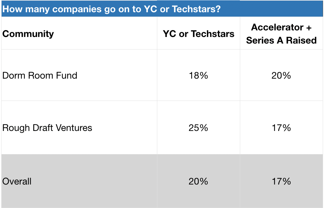 Dorm Room Fund y Rough Draft Ventures envían entre 18 y 25% de sus compañías de cartera a Y Combinator o Techstars. Dado el índice de aceptación del 1.5% de YC como se informó en Fortune, ¡esto es bastante significativo! Internamente, estos dos fondos ofrecen a los fundadores la oportunidad de participar en entrevistas simuladas con YC y ex alumnos de Techstars, así como aprovechar sus comunidades para el apoyo entre pares (por ejemplo, consejos sobre plataformas de lanzamiento y contenido de la aplicación). Como resultado, Dormroom Fund y Rough Draft Ventures envían regularmente cohortes de fundadores a estos prestigiosos programas de aceleradores. Según nuestro conjunto de datos, entre el 17 y el 20% de las compañías de DRF y RDV que asisten a uno de estos aceleradores terminan recaudando financiamiento de riesgo de la Serie A.
