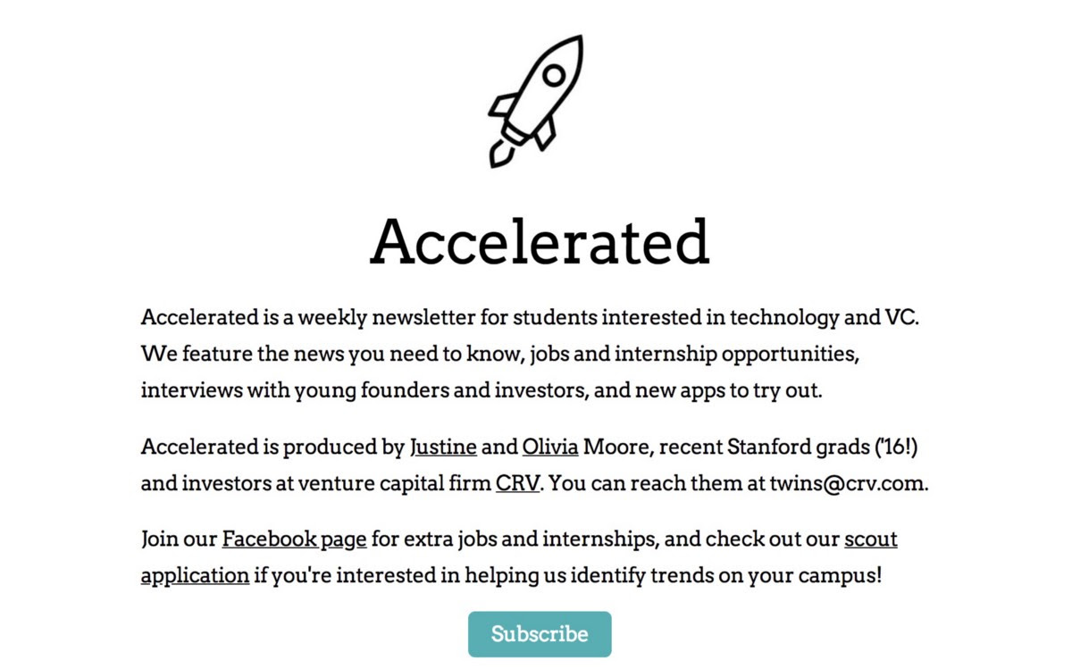 Los fundadores de estudiantes tienen una serie de nuevos recursos de medios a los que recurrir. Los nuevos boletines por correo electrónico centrados en el espíritu empresarial de los estudiantes como Justine y Olivia Moore, Starteler y Kyle Robertson, StartU, ofrecen nuevos canales para que los jóvenes fundadores lleguen a grandes audiencias. Justine y Olivia, las mentes detrás de Accelerated, tienen muchas credenciales en la calle: lanzaron la incubadora en el campus Cardinal Ventures de Stanford antes de ingresar como inversores en CRV.
