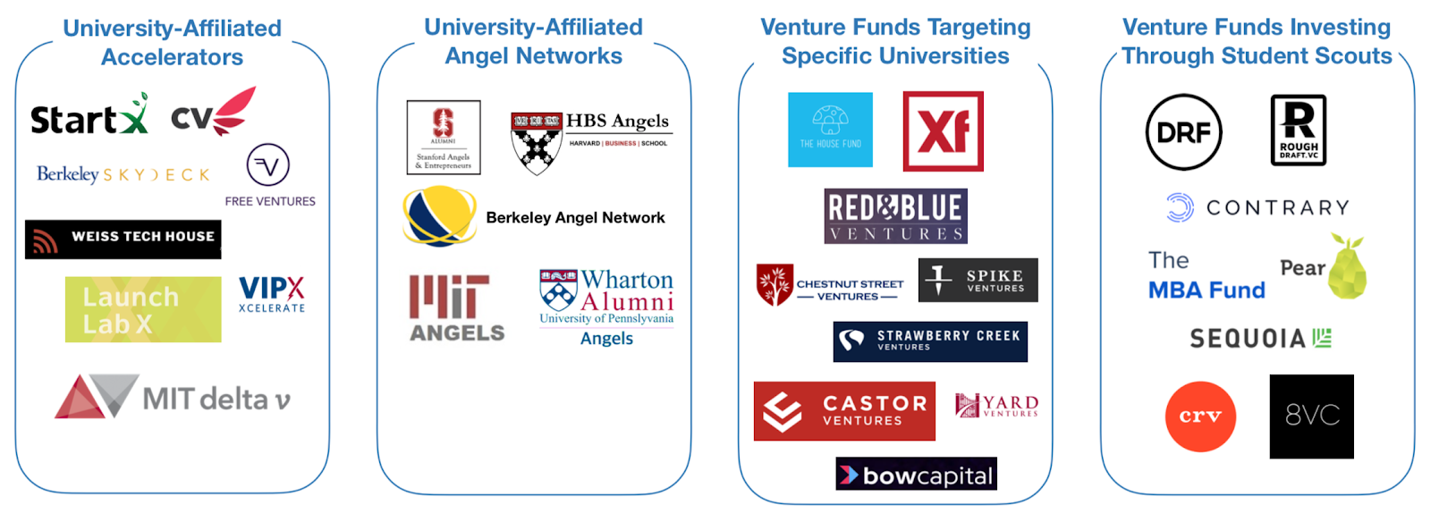 Un fondo centrado en el alumnado a destacar es el Alumni Ventures Group, que agrupa capital LP de exalumnos en universidades específicas, y luego lanza fondos de riesgo individuales que invierten en fundadores conectados a esas universidades (por ejemplo, estudiantes, ex alumnos, profesores, etc.). A través de este modelo, ¡han implementado más de $ 200 millones por año! Otro aspecto destacado ha sido los programas de estudiantes exploradores, que varían en el grado de autonomía e inversión de capital, pero esencialmente les permiten identificar y financiar compañías de alto potencial para los fondos de la empresa matriz. En los campus con una gran concentración de fundadores de estudiantes, no es raro encontrar estudiantes exploradores de hasta 12 fondos de riesgo diferentes que busquen activamente ofertas (como queda claro en el análisis de David Tao en UC Berkeley).