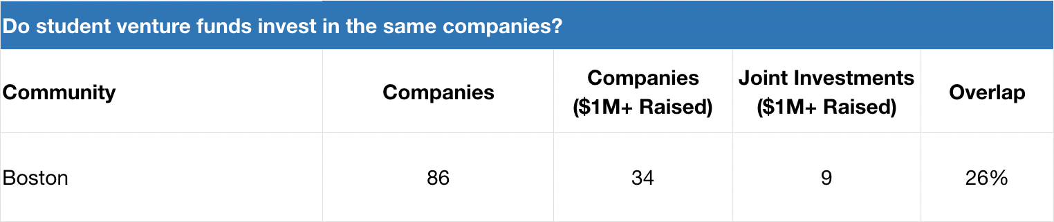 Dorm Room Fund y Rough Draft Ventures no invierten en las mismas empresas. Cuando analizamos más a fondo un ecosistema específico en el que estos dos fondos han estado igualmente activos durante los últimos años, Boston, en realidad vemos que el grado de superposición de inversión para las compañías que han recaudado más de 1 millón de rondas de semillas es del 26%. Esto sugiere que estos fondos están a) viendo diferentes flujos de transacciones o b) tienen decisiones de inversión muy diferentes.