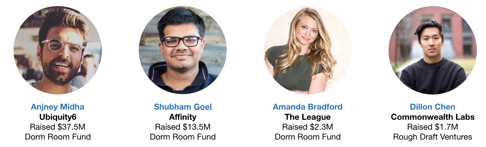 Dorm Room Fund y Rough Draft Ventures tienen alumnos impresionantes que querrás seguir. 1 de cada 4 ex alumnos socios son fundadores, y el 29% de estos fundadores fundadores han recaudado más de $ 1 millón de rondas de semillas para sus empresas. Estos incluyen la puesta en marcha de realidad aumentada de Anjney Midha, Ubiquity6 (recaudó $ 37M +), la startup de CRM centrada en el inversor de Shubham Goel, Affinity (recaudó $ 13M +), la startup de software de seguridad AI de Bruno Faviero, Synapse (recaudó $ 6M +), la aplicación de citas de Amanda Bradford The League (recaudó $ 2 M +), y el inicio de la cadena de bloques de Dillon Chen, Commonwealth Labs (recaudó $ 1.7M). Para mí, tiene sentido que los ex alumnos de estas comunidades que deciden iniciar compañías tengan una ventaja sobre sus pares: saben cómo se ven las buenas empresas y pueden aprovechar las poderosas redes de jóvenes talentos / inversionistas experimentados.