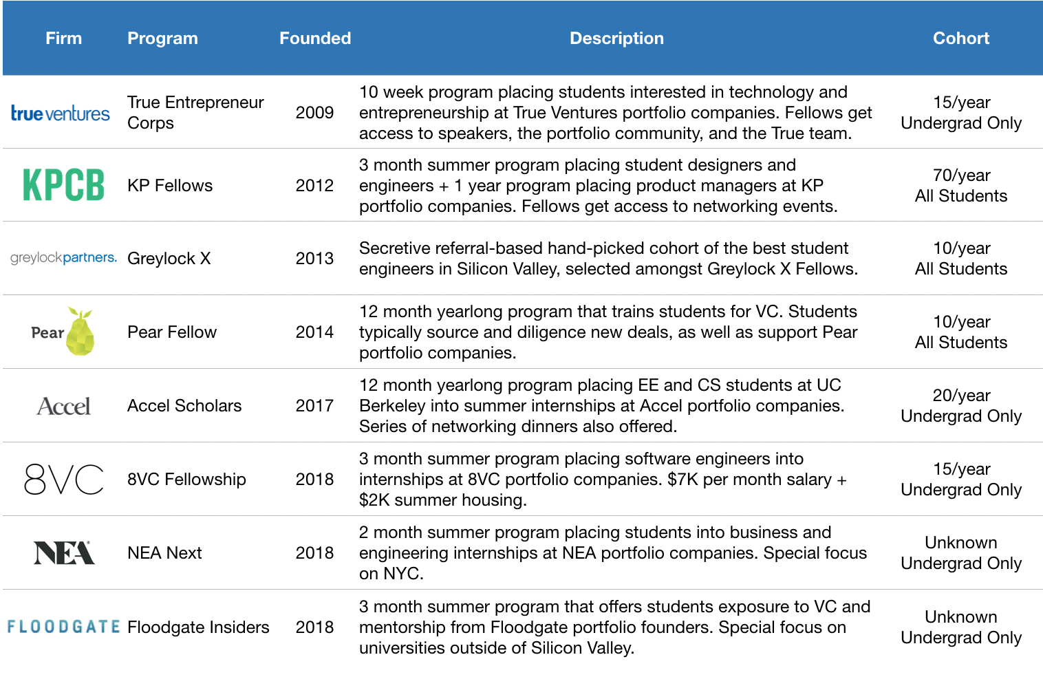 Veamos ahora a los estudiantes que desean unirse a una startup antes de fundar uno. Históricamente, los fondos de riesgo han buscado atraer talentos a los estudiantes y están expandiendo el ciclo de vida del compromiso. Los programas de mayor duración incluyen Kleiner Perkins ' class = “m_1196721721246259147gmail-markup – strong m_1196721721246259147gmail-markup – p-strong”> Fellows KP y True Ventures ’ Fellows TEC, que se centran en colocar a los gerentes de productos, ingenieros y diseñadores más prometedores de la próxima generación en las compañías de cartera de sus fondos de empresas matrices.