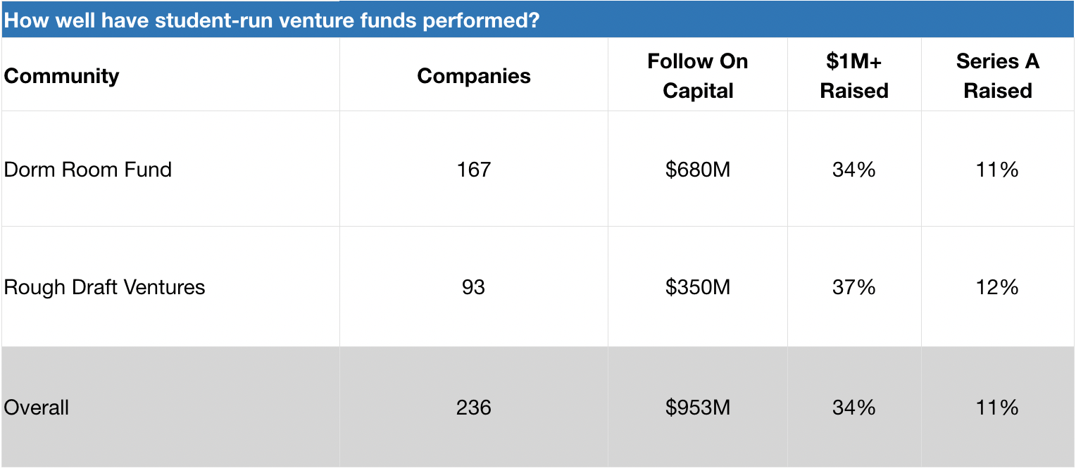 En mi opinión, las dos instituciones que tienen la línea de visión más amplia en el panorama empresarial estudiantil son: Fondo de la habitación de la primera ronda y Rough Draft Ventures de General Catalyst. Desde 2012, estos dos fondos han operado una red nacional de estudiantes exploradores que han invertido $ 20K – $ 25K en compañías fundadas por estudiantes emprendedores en más de 40 universidades. “Scout” es un término vago y no le hace justicia: los inversionistas estudiantes de estos dos fondos son casi totalmente autónomos, han creado sus propios servicios de plataforma para apoyar a las empresas de cartera y han lanzado programas para incubar compañías creadas por fundadoras y Fundadores del color. Otro fondo administrado por estudiantes que vale la pena mencionar que ha llegado más allá de una sola región es Contrary Capital, que recaudó $ 2.2M el año pasado. Hacen un excelente trabajo al llegar a los fundadores en un conjunto diverso de escuelas: su red de exploradores estudiantiles está activa en 45 universidades y ha hablado con 3.000 fundadores por año desde que comenzó. Lo contrario también está probando lo que describen como un “YC para fundadores basados en la universidad”. En su primera cohorte, el 100% de sus compañías plantearon una ronda previa a la siembra después del día de demostración de Contrary. Otra organización aún más recientemente lanzada es The MBA Fund, que abastece a fundadores de las escuelas de negocios de Harvard, Wharton y Stanford. Aunque son muy emocionantes, estos dos fondos solo se lanzaron muy recientemente y administran carteras que aún no son lo suficientemente grandes para el análisis.