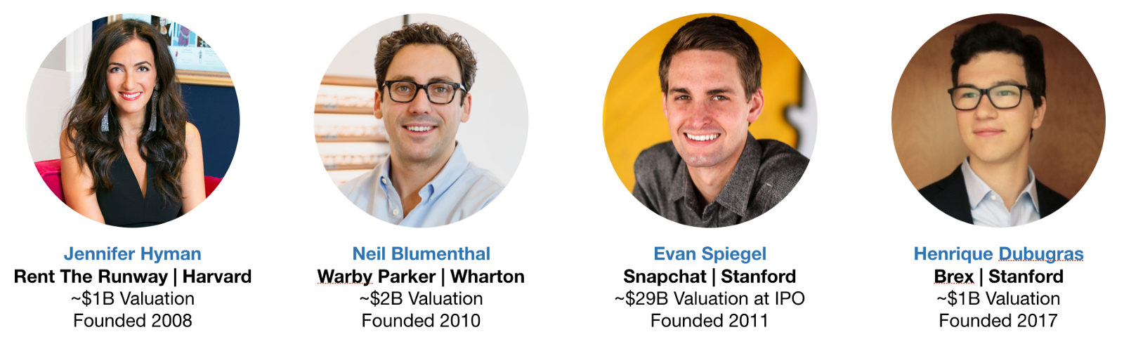 De hecho, algunos de nuestros fundadores más icónicos son Bill Gates de Microsoft. y de Facebook Mark Zuckerberg, ambos estudiantes empresarios que lanzaron sus nuevas empresas en Harvard y luego abandonaron para convertir a sus compañías en los principales gigantes tecnológicos. Una muestra de la actual generación de compañías de carpa fundadas en los campus universitarios incluye Snap en Stanford (valor de $ 29B en IPO), Warby Parker en Wharton (valor de $ 2B), Rent The Runway en HBS (valor de $ 1B) y Brex en Stanford (~ $ 1B valoración).