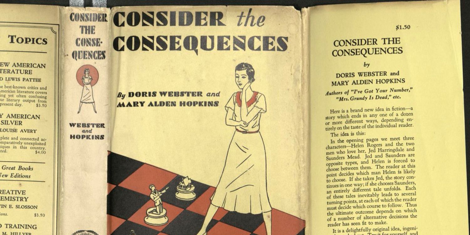 El primer librojuego moderno fue una novela romántica llamada Considera las consecuencias, coescrito por los autores Doris Webster y Mary Alden Hopkins y publicado en 1930. La portada de este libro, que representa a una mujer de pie sobre un tablero de ajedrez/damas con las piezas de juego de sus pretendientes, insinúa tanto la innovadora estructura del juego del libro y el triángulo amoroso central en las muchas tramas ramificadas de la novela. Según un artículo en Revista Smithsonianlos lectores inician una reproducción de Considera las consecuencias eligiendo entre tres personajes de punto de vista: una mujer llamada Helen Rogers, o uno de sus dos pretendientes, Jed Harringdale y Saunders Mead. Además de ser pionero en las convenciones de los libros de juegos por excelencia, como decirles a los lectores que salten a ciertos párrafos/páginas, Considera las consecuencias tiene una estructura de trama ramificada que avergüenza a muchas novelas visuales modernas, y contiene 43 finales diferentes a los que los lectores pueden llegar dependiendo de sus elecciones y protagonistas elegidos.