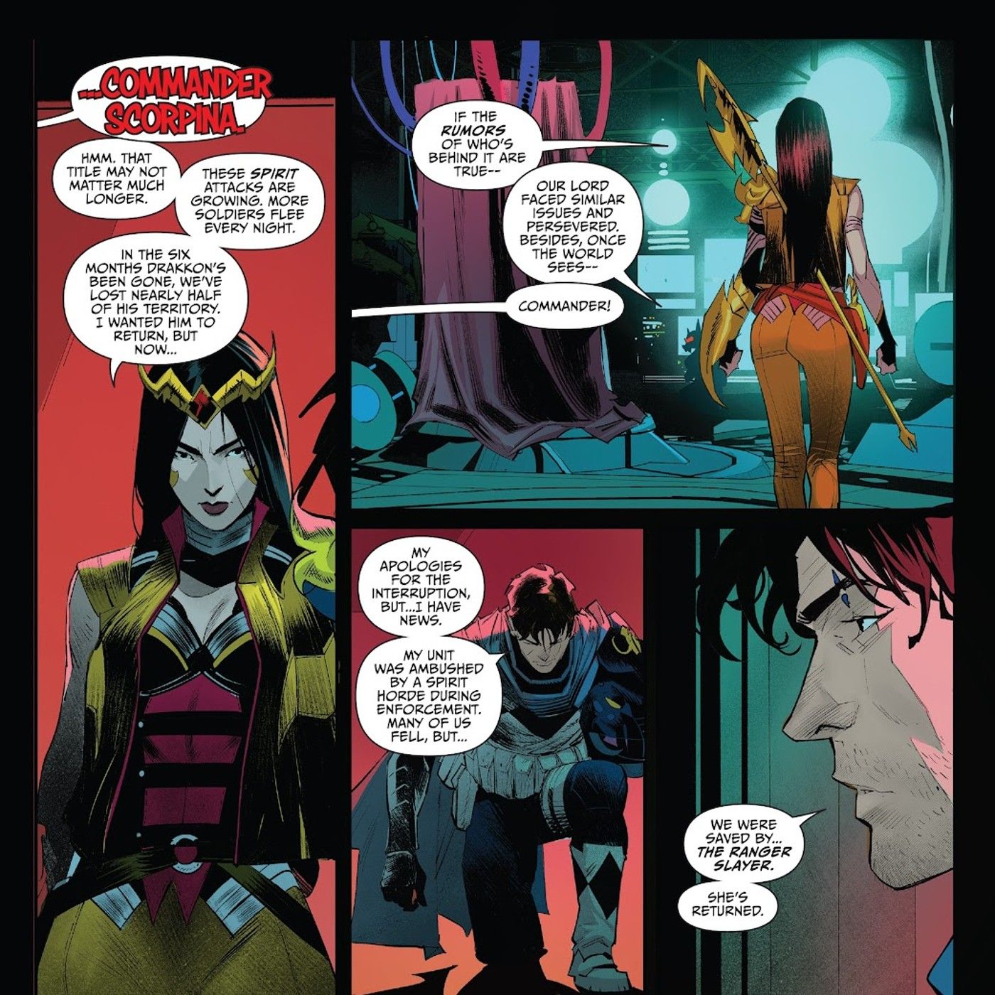 Poderosos Morphin Power Rangers #1 marcó el debut cómico en el panel de Scorpina, quien inmediatamente representó una amenaza al aparecer repentinamente en la habitación de Tommy Oliver con una espada en la garganta. El segundo número de la serie comienza con ella dejando en claro que está allí para recuperar la Dragon Power Coin de Rita. Obviamente, Tommy no lo entregará sin luchar. Así comienza una batalla campal entre dos luchadores de clase mundial, con Scorpina defendiéndose del icónico Ranger.
