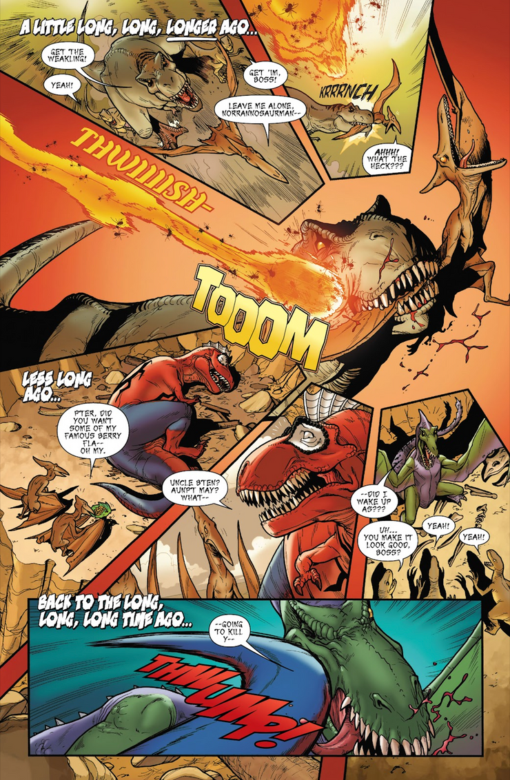 Marvel ha elegido intentar crear una versión dinosaurio de Spider-Man en Borde de Spider-Verse #1. En la historia Araña-Rex! Escrito por Karla Pacheco con arte de Pere Perez, Norman Osborn persigue a Peter Parker, o más bien, “Norrannosaurman” persigue a “Pter Ptarker”, a través de una densa jungla. El arte muestra al T-Rex Osborn mordiendo el ala de Ptarker segundos antes de que un meteorito cubierto de arañas se estrelle contra la mandíbula del Rex. Más tarde ese día, Pter Ptarker y Norrannosaurman descubren que se han transformado en diferentes dinosaurios y están armados con superpoderes.