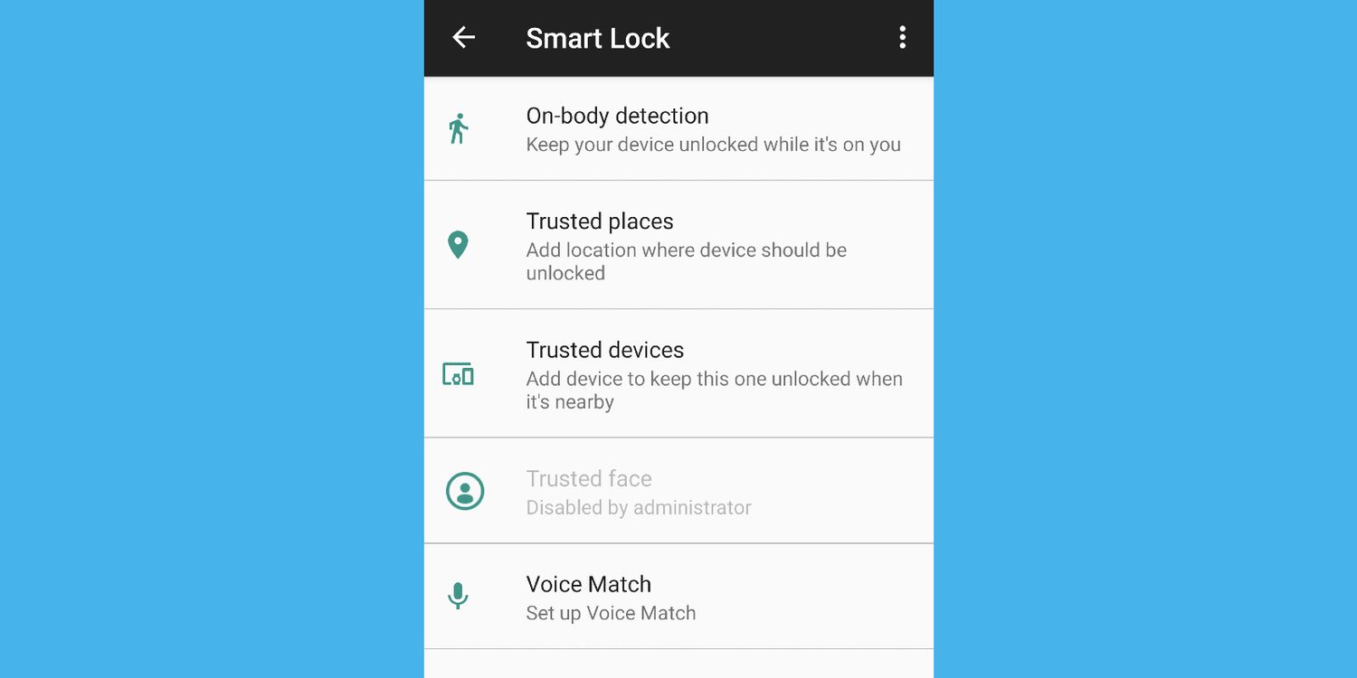 La segunda configuración usa Bluetooth para emparejar el teléfono con otro dispositivo que desbloqueará automáticamente el teléfono una vez conectado. Esta configuración debe evitarse cuando se usan dispositivos que siempre están con el teléfono, como relojes inteligentes, para evitar problemas de seguridad. Los teléfonos que ejecutan versiones anteriores de Android también pueden usar Voice Match o Trusted Face para desbloquear su teléfono. Si el teléfono Android reconoce el comando de voz del usuario o su rostro de confianza, se desbloqueará.