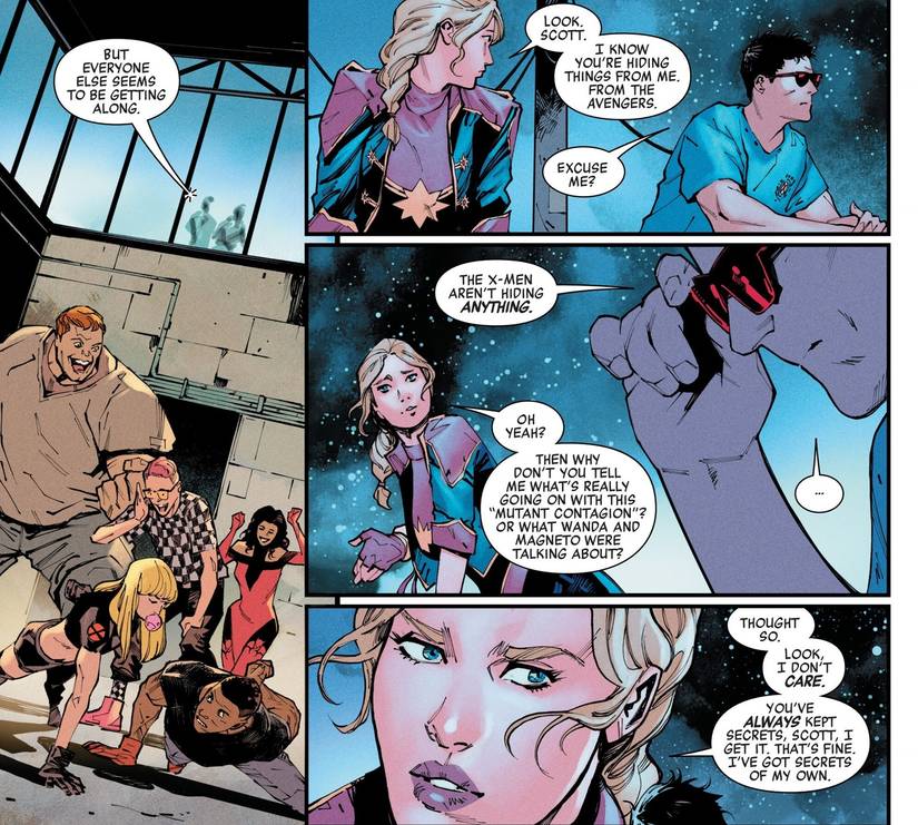 Si bien Cyclops parece más reacio que Captain Marvel a aceptar abiertamente una alianza, ambos líderes saben que no pueden capear las tormentas que se avecinan solos. Sus equipos continúan manteniendo ciertas cosas en privado, pero aceptar apoyarse mutuamente en un acuerdo directo es un gran paso. La confianza es difícil de conseguir, especialmente para los mutantes, pero eso es lo que Carol y Scott se ofrecen mutuamente. No sólo ofrecen ayuda o apoyo moral, sino una manera de avanzar uno al lado del otro. No son los X-Men ni los Vengadores, sino los X-Men y los Vengadores, que por fin trabajan en conjunto.