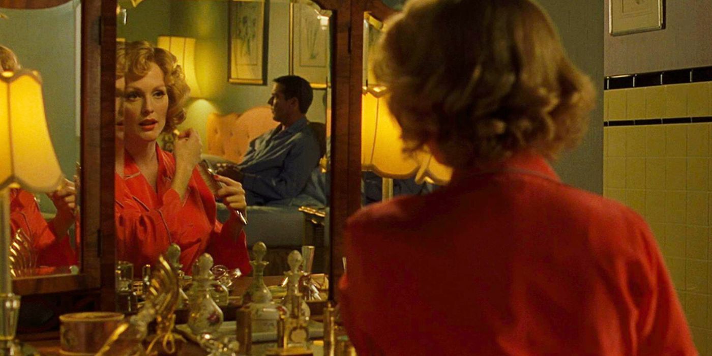En Lejos del cielo, la vida aparentemente perfecta de Cathy comienza a desmoronarse cuando su marido, Frank (Denis Quaid), es encontrado examinando el entonces ilícito mundo subterráneo de los bares gay de Hartford. Mientras atraviesa su tenso matrimonio, Cathy conoce a Raymond Deagan (Dennis Haysbert), el hijo de su difunto jardinero. Después de encontrarse con Raymond en una exposición de arte local, los dos se hacen amigos. Esto genera consternación en otros miembros de la comunidad, quienes se sorprenden al ver que se forma un vínculo estrecho entre una mujer blanca y un hombre negro. Tan trágico como agudo, Lejos del cielo Moore obtuvo una nominación al Oscar por la que considera su mejor interpretación. (a través de HuffPost).