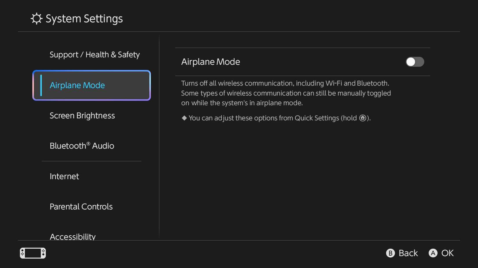 Para encontrar la opción para alternar y desactivar el modo del avión, vaya a la configuración del sistema y seleccione el modo de avión. Está en la parte superior del menú Configuración del sistema, justo debajo “Soporte/Salud y Seguridad”. Es una ventanilla única para Wi-Fi y Bluetooth. También puede mantener presionados el botón de inicio en su Nintendo Switch 2 Y alternarlos de esa manera sobre la marcha sin entrar en el menú Configuración del sistema, al igual que una interfaz de usuario de un teléfono inteligente.