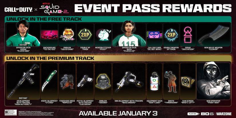 Según el tráiler oficial, Call of Duty: Black Ops 6la colaboración con Juego del Calamar se lanzará el 3 de enero de 2025.. Un blog oficial de Call of Duty también ha revelado que Juego del Calamar será recibir su propio Pase de Evento con una Pista Gratuita y Premiumpor lo que los jugadores que quieran tener la mejor oportunidad de desbloquear todos los elementos nuevos probablemente querrán participar el día de su lanzamiento.