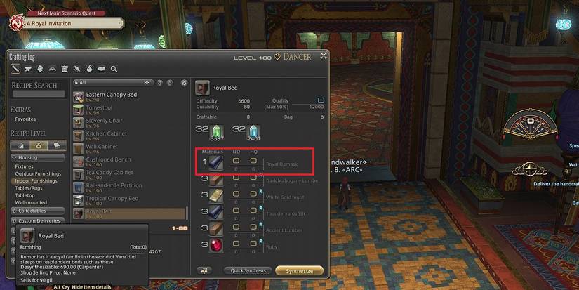 No puede elaborarse como un artículo de alta calidad, pero aún necesitas 4207 Artesanía para hacerlo. Luego, estará listo para colocar la Cama Real en su propia casa o apartamento, o puede colocarla en Marketboard para obtener alguna ganancia. En Balmung se venden por poco menos de 5 millones de gil. Sin embargo, Royal Damask se vende por poco menos de 4 millones de Gil, por lo que una cantidad considerable reducirá tus ganancias si lo compras para hacer la Cama Real.