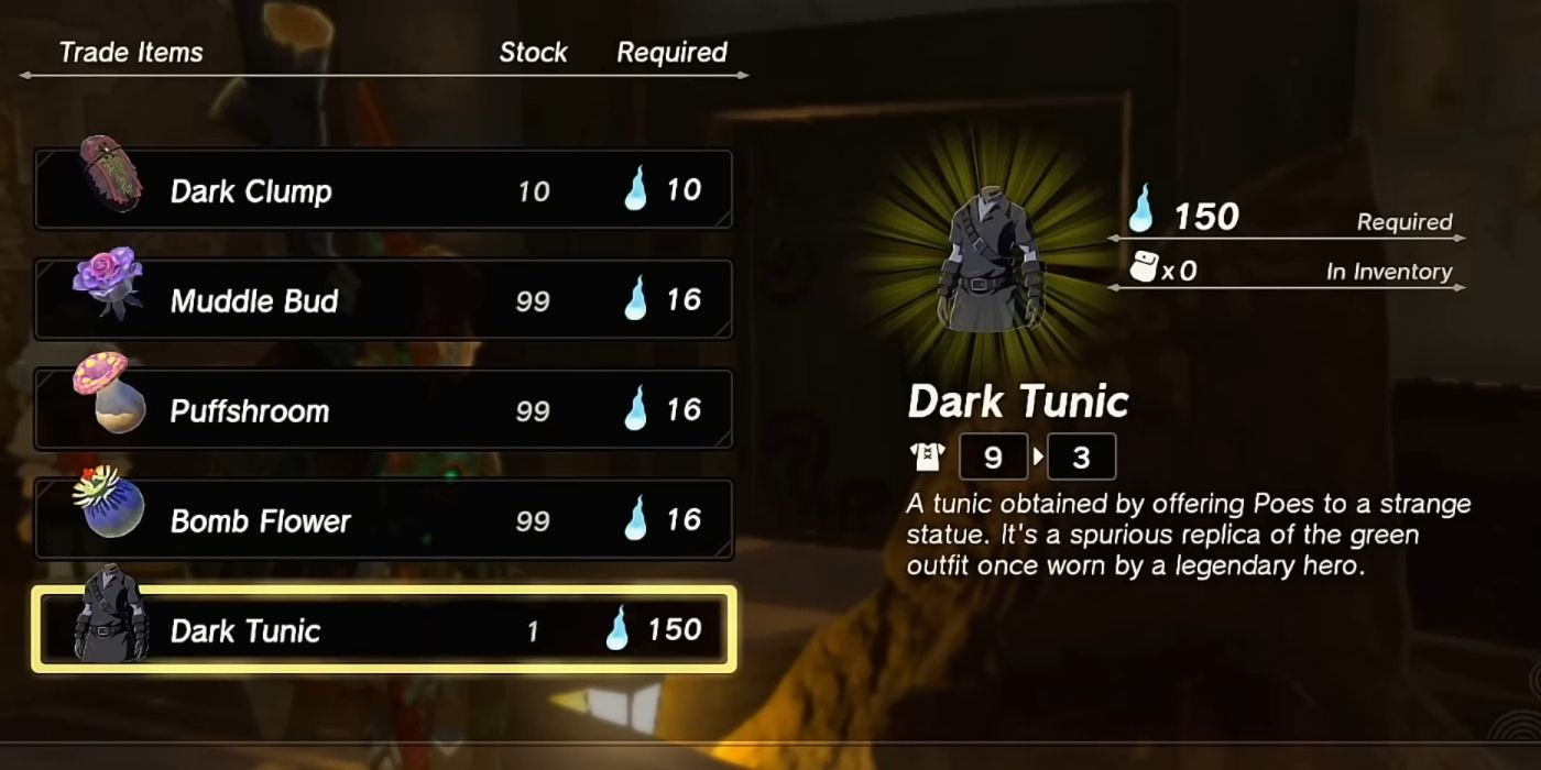 La primera estatua del regateador en Zelda: lágrimas del reino se puede encontrar dentro del edificio principal de Lookout Landing. Al entrar e interactuar con la pequeña figura de piedra, los jugadores pueden optar por ofrecer Poes e inmediatamente comprar la Túnica Oscura por 150 Poes. Esta primera pieza en el conjunto Dark Link está disponible desde el principio y requiere solo el recurso en lugar de cualquier proceso de desbloqueo. Las próximas dos piezas, sin embargo, harán que el jugador explore más.