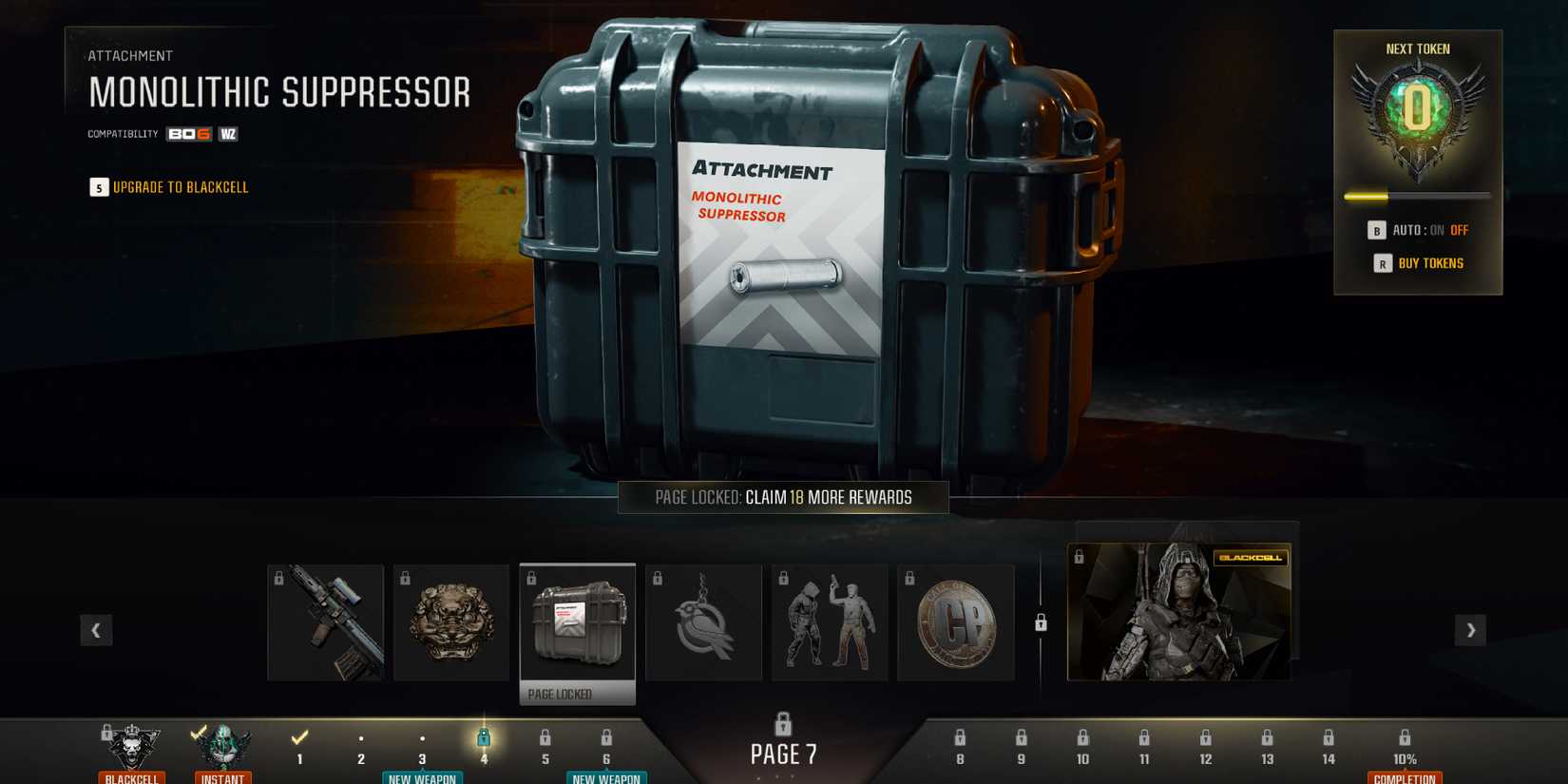 Puede Solo obtenga el supresor monolítico tan rápido si ha comprado el pase de batalla. Si no ha comprado el Pase de batalla, no podrá alternar la opción Auto-Complete y tendrá que completar las seis páginas anteriores y los dos desbloqueos antes del supresor monolítico en la página Siete.