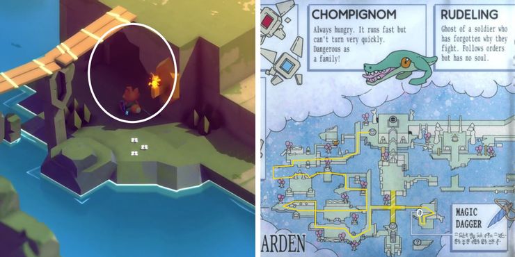 Al final de las ruinas, los aventureros pueden subir la rampa de madera para caminar sobre la pared. Continúe hacia adelante, teniendo en cuenta los tres Chompignoms y dos hostiles zelda-Como hadas en las siguientes áreas. A continuación, suba al paso elevado y gire a la derecha en la intersección. Ve hasta la isla más al este, pero ten cuidado con los dos chompignoms agresivos que vigilan la escalera que conduce a la cueva de la daga. Después de abrir el cofre del tesoro, ingresa a la entrada de la caverna a la izquierda. En el interior, Sayo los jugadores encontrarán la Daga Mágica sentada sobre un altar en la parte trasera de la habitación.
