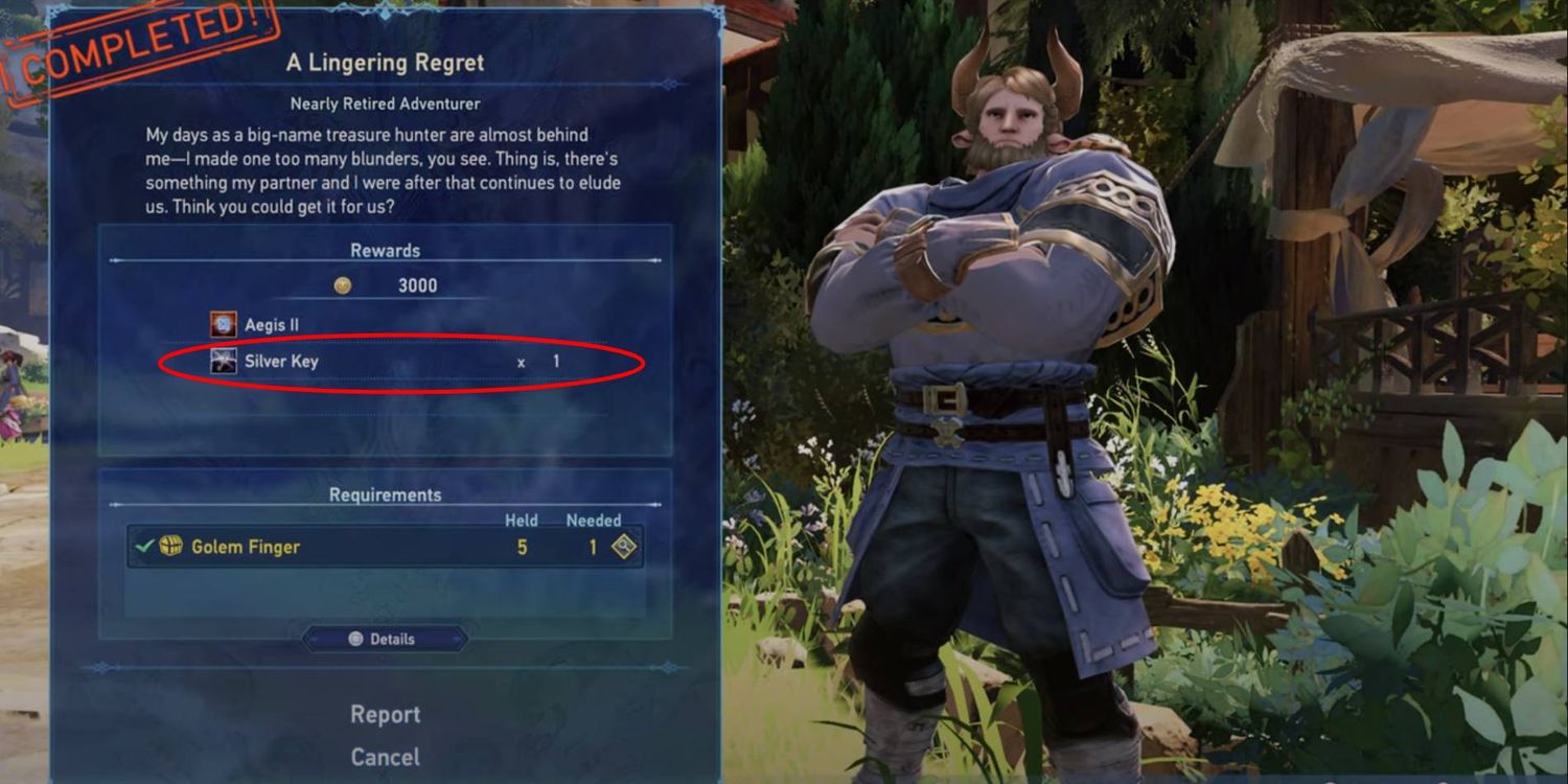 La llave de plata es otorgado como recompensa por el aventurero recién retirado Puedes encontrarte en la plaza principal de Folca. Este personaje ofrece una misión secundaria llamada “Un arrepentimiento persistente” que tenga una llave de plata como premio junto con 3000 Rupies y un Sello Aegis III. Sólo tienes que darle al Aventurero Jubilado unoDedo de gólem en Granblue Fantasy: volver a vincular para completar la misión.