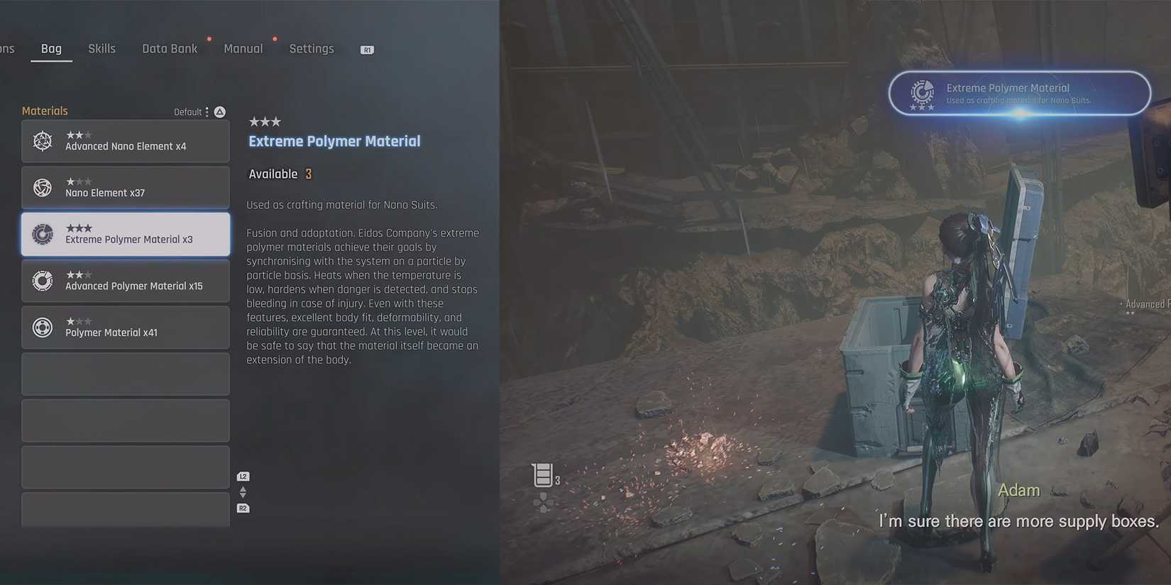 Hay tres tipos de materiales poliméricos en Stellar Blade. Materiales poliméricos regulares, materiales poliméricos avanzados y materiales poliméricos extremos, todos ellos valiosos, pero la versión “Extrema” es la más valiosa y la más difícil de encontrar.