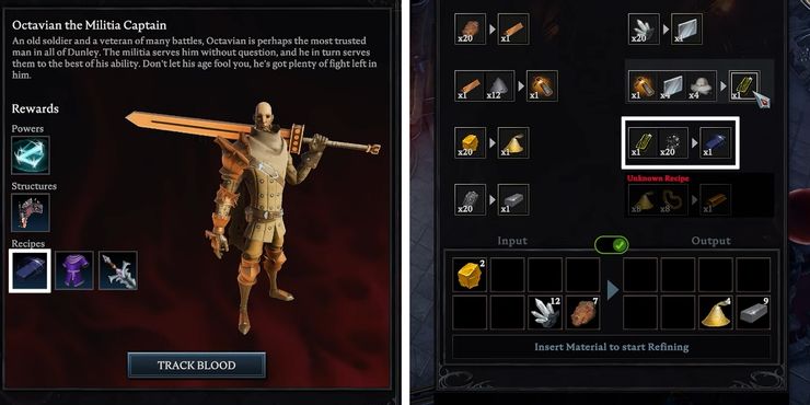 Antes de que los aventureros sedientos de sangre puedan fabricar Dark Silver en su castillo, primero deben desbloquear la receta para el lingote de Dark Silver cazando a Octavian, el capitán de la milicia. Este jefe de sangre de nivel 58 V se puede encontrar en la arena norte del Bastión de Dunley en Dunley Farmlands. Una vez que este adversario ha sido derrotado, V ascendente los fanáticos tendrán acceso a la producción de lingotes de plata oscura y al yunque, la estación de trabajo necesaria para fabricar armas de plata oscura. Para producir un lingote de Dark Silver, los herreros vampiros necesitarán Scourgestone ×1 y Silver Ore ×20.