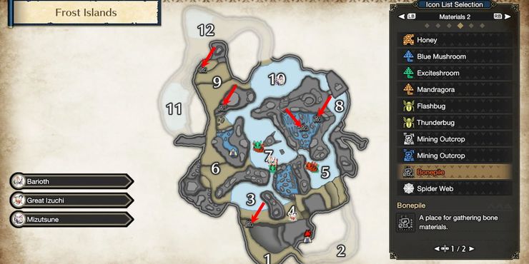 Las Frost Islands son uno de los lugares originales de El ascenso del cazador de monstruos donde los jugadores pueden luchar contra todo tipo de monstruos helados. En el corazón de Frost Islands hay un enorme conjunto de huesos de dragón, que presagian los tipos de materiales que se pueden recolectar aquí. Si bien los jugadores pueden saquear todo tipo de huesos en Frost Island, los Frozen Stiffbones son más difíciles de encontrar. Además de buscar materiales, los jugadores también deben cazar algunas bestias clásicas, como Great Baggi de Monster Hunter Rise, que proporcionará el Master Ranked Torpor Sac.