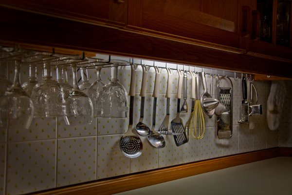 No se olvide del interior de sus alacenas, que es un gran espacio para colgar herramientas de cocina planas, especialmente las que usa con frecuencia. Hay muchas formas de hacerlo, incluido el uso de ganchos para tazas o incluso tiras magnéticas.