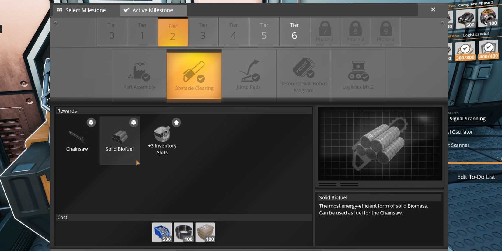 Una vez que desbloqueas la mejora Eliminación de obstáculos en el Nivel 2, mantener tu fábrica con combustible es aún más fácil con la introducción de Solid. Biocombustible. No sólo arde mucho más lento en los Quemadores de Biomasa, sino que también es necesario para alimentar varios equiposcomo Chainsaw y Jetpack.