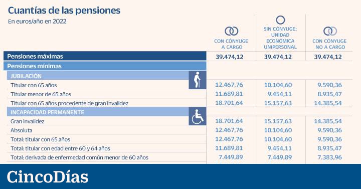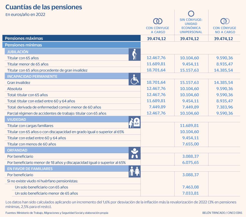 El dato adelantado de inflación publicado por el INE deja ya cerrada, solo a falta de confirmación definitiva a mediados de mes, la revalorización de las pensiones para el ejercicio 2022. Según los cálculos de Cinco Días a partir de los datos del IPC y de los anuncios del Ejecutivo, la pensión máxima escalará en 2022 hasta rozar los 39.474 euros en 14 pagas, que suponen 2.820 euros mensuales. Esta pensión sube en 112 euros sobre los 2.707 de 2021.