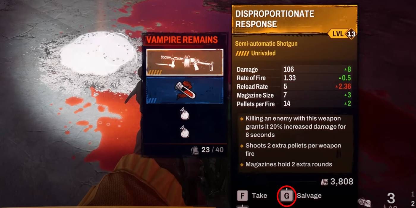 Todas las armas averiadas proporcionan la misma moneda sin importar qué rareza se salva. Lo más probable es que los jugadores usen este dinero para comprar más municiones para las tres armas principales en su rueda de armas o Equipo medico para ayudar durante secciones peligrosas como Vampire Nests. Dado que no hay exactamente un botón de pausa en el juego, se recomienda a los jugadores que recuperar armas en un área segura fuera del combate.