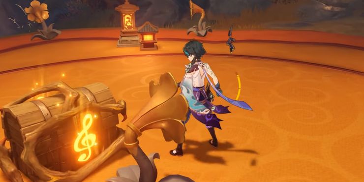 En el piso inferior seco de la cueva, los viajeros descubrirán una caracola de imágenes en Impacto Genshin, uno de los coleccionables necesarios para desbloquear Ein Immernachtstraum, el nuevo atuendo de personaje de Fischl. Un Cofre Común también se encuentra en el centro de la habitación, aunque cubierto de raíces. Para eliminar las raíces, ajusta la orientación de los gramófonos y usa la guitarra grande en el área para tocar una sola nota que pueda desbloquear el cofre.