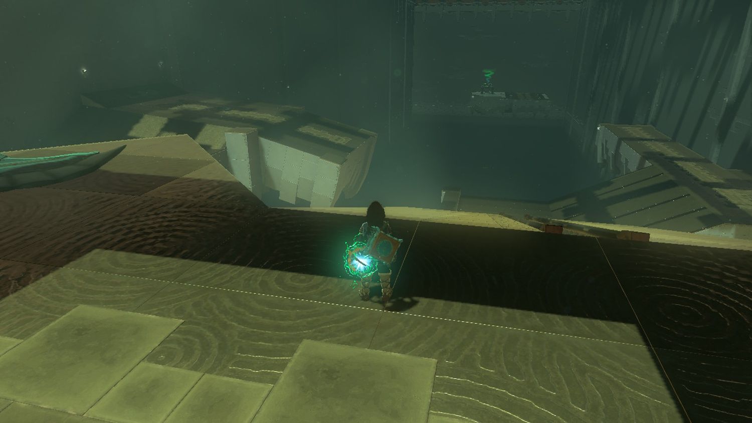 Link debe cruzar los abismos del Santuario Jirutagumac usando Zonai Wings. Al entrar al Santuario, Link encontrará una gran plataforma con tres pasarelas y dos Zonai Wings. Coge un ala Zonai con Ultrahand y déjalo en la pista de la izquierda. El Ala Zonai debería deslizarse hacia la plataforma de la izquierda. Deslízate hacia la misma plataforma.