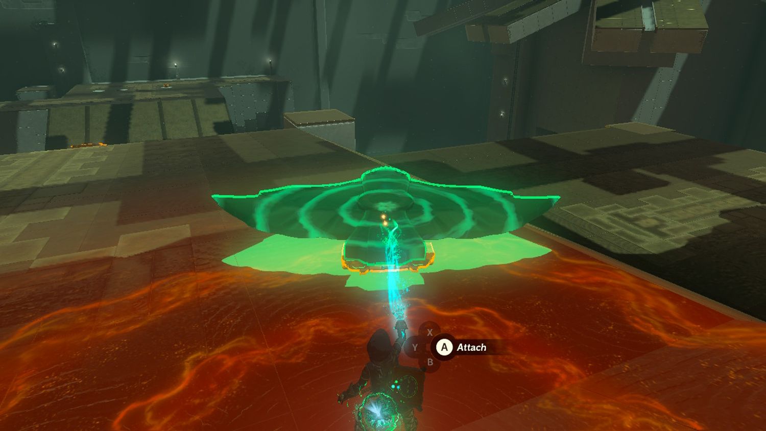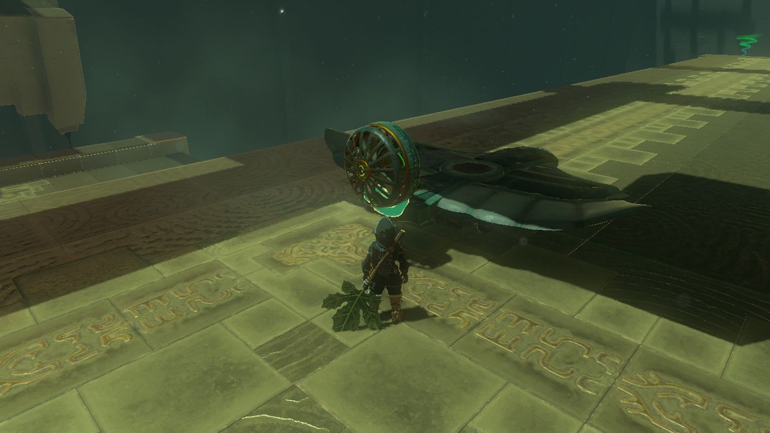 Más adelante, Link verá algunos carros. Usando Ultrahand, coloque el Ala Zonai en la parte superior de un carro y envíelo por la pendiente, para que se deslice hacia el otro lado de la habitación.