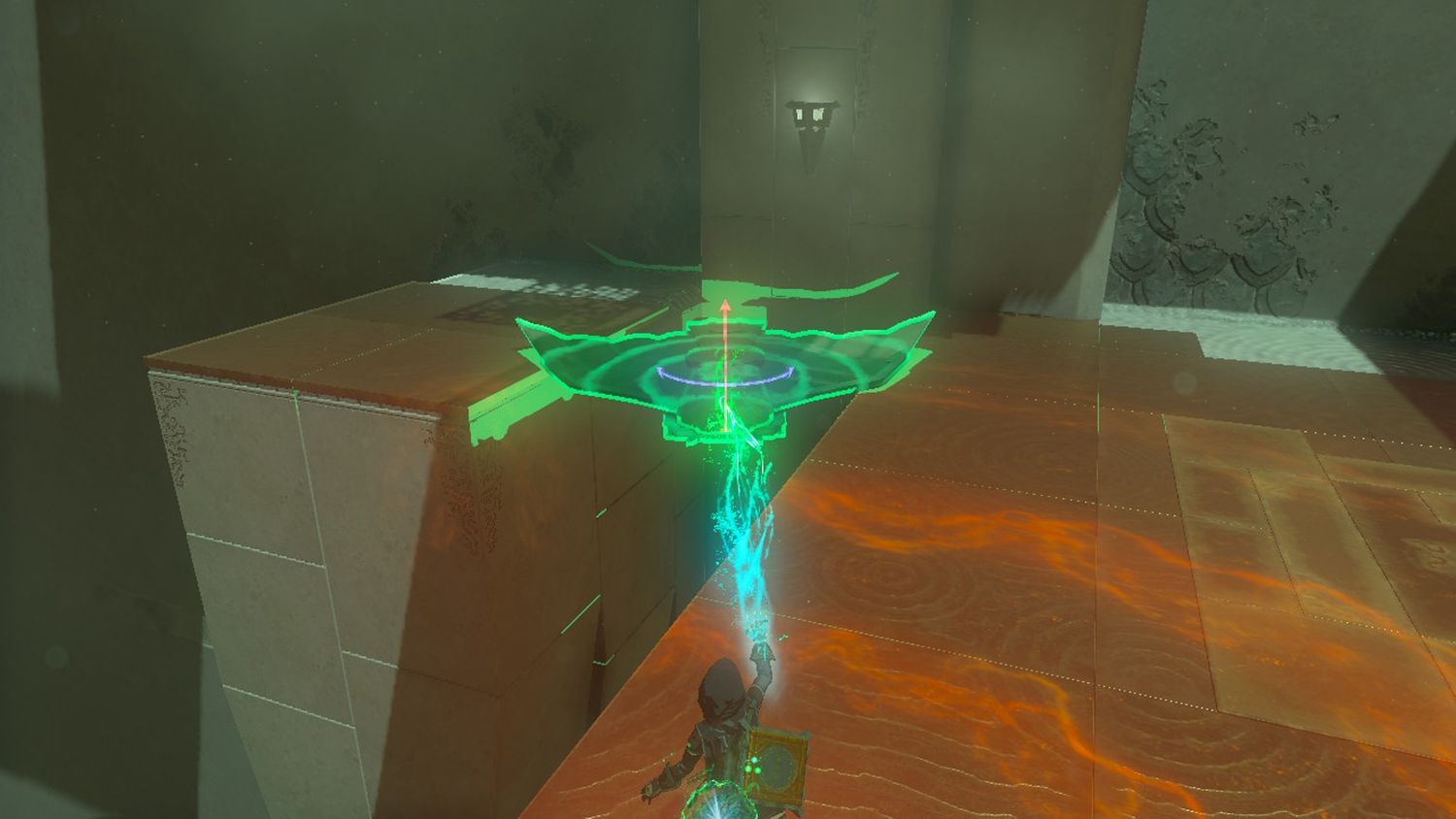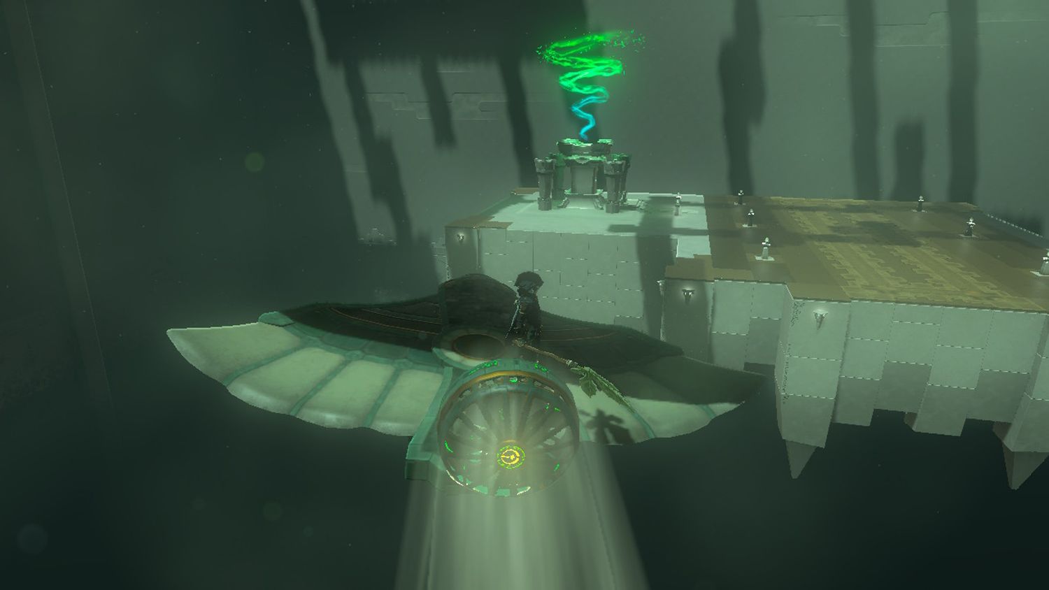 Coloca el Ala Zonai en la pista, súbete y activa el ventilador. El Ala Zonai debería llevar a Link hasta el final del Santuario Jirutagumac, donde los jugadores pueden reclamar un Luz de Bendición.