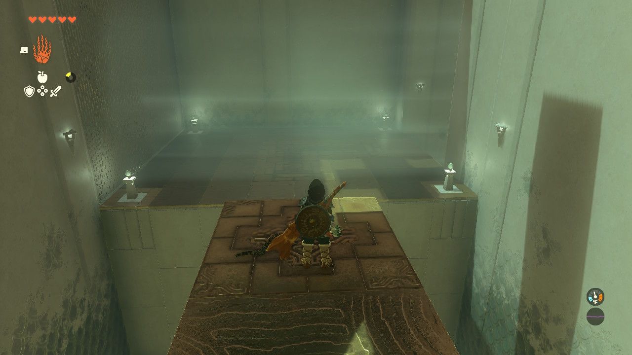 En la habitación de al lado, hay un viento que viene del suelo y empuja constantemente a Link hacia arriba mientras usa el parapente. Navega por el centro de la habitación donde está la plataforma circular con grietas. Bucear de nuevo. Link cae con bastante lentitud aquí, y dependiendo de cómo aterrice, puede hacerlo sin recibir daño. Salta y presiona X para estrellarse contra el suelo y romper la plataforma.