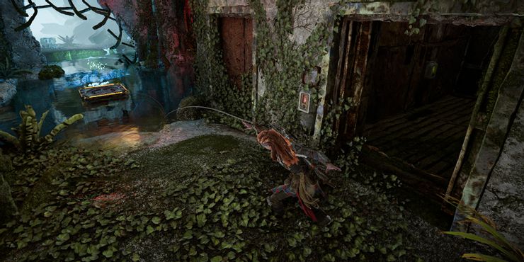 Desde la puerta cerrada, los jugadores deberán dar la vuelta y sumergirse en el charco de agua nadando hacia una puerta que conduce a una nueva sección en Horizonte Prohibido Oeste. Se puede recolectar una caja de objetos de valor antiguos bajo el agua antes de ingresar a la nueva área, y en el otro lado de la puerta, se puede encontrar una caja fuerte de objetos de valor antiguos. En el lado izquierdo, hay un lugar para nadar y entrar en una habitación con un poco de Firegleam que abre una ruta alternativa hacia las ruinas. Dentro de la habitación, hay una caja que se puede sacar del agua y arrastrar al otro lado. Luego, los jugadores pueden nadar hasta el otro lado, luego dar la vuelta para tirar de la caja a través del agua y dejar que se detenga un poco antes de llegar a la plataforma para que quede alineada con los agujeros en la pared. Horizonte Prohibido OesteEntonces, Aloy puede subirse a la caja y disparar a través del agujero en la pared para derribar la escalera que cuelga del otro lado.