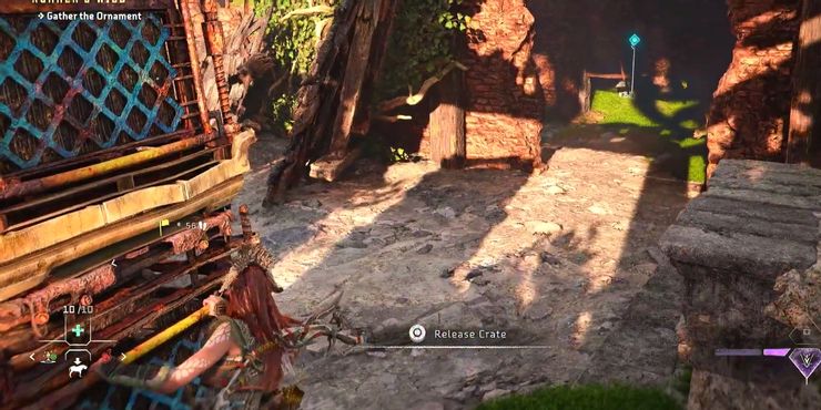 Con las dos cajas ahora apiladas, Aloy puede llegar a dos nuevas áreas, la primera es un techo roto con una caja de suministros antigua. La segunda área está dentro de la habitación que tenía el Firegleam. Empuje las cajas al lado de la pared y suba para obtener un módulo clave. Esta llave abrirá la puerta cerrada cerca de la entrada de las ruinas. Dentro de la habitación, los jugadores encontrarán otra caja de botín y una pared que se puede romper con la herramienta Pullcaster en Horizonte Prohibido Oeste.