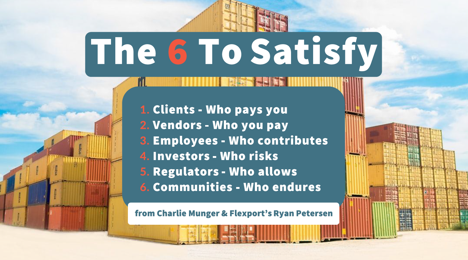 El primer marco es del mentor de Petersen y magnate de los negocios estadounidenses Charlie Munger. Establece las seis partes interesadas o “clientes” que una empresa debe satisfacer para tener éxito. Así es como los describe Petersen: