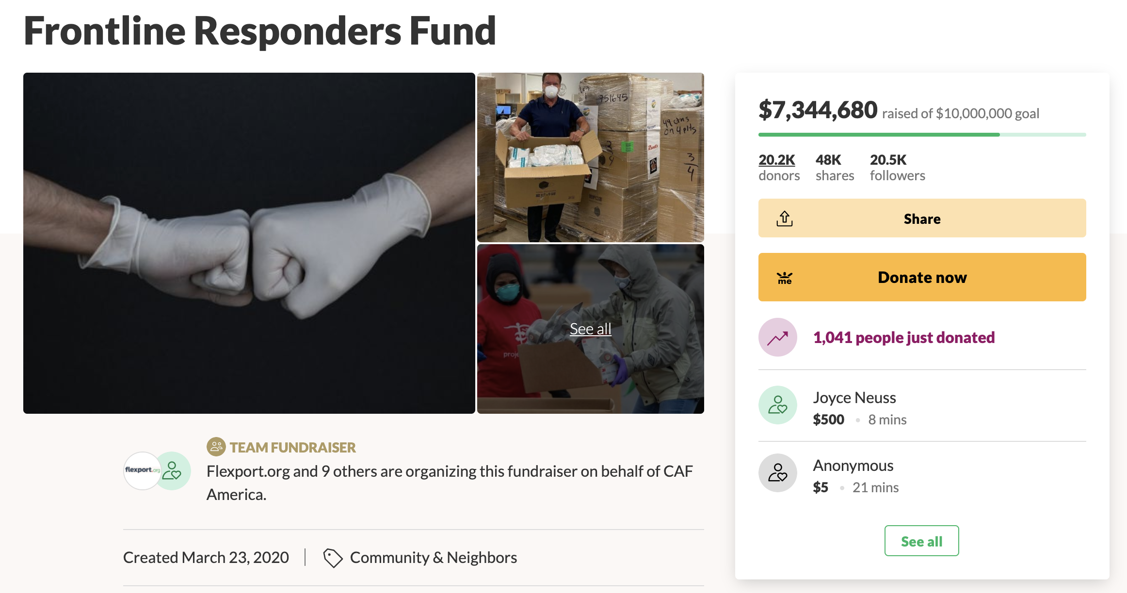 “El 100% de su donación para esta causa se destinará directamente al envío de máscaras a personas en primera línea lo más rápido posible. Te doy mi palabra de que no desperdiciaremos un centavo de tu dinero “, tuiteó Petersen. A pesar de que su negocio se encontró con sus propios problemas con el comercio mundial y la demanda interrumpida, pasó a dedicar todo su tiempo a administrar Flexport.org y promover el FRF. Con la ayuda de celebridades como Arnold Schwarzenegger y Edward Norton, se recaudaron más de $ 7 millones. El FRF ha entregado más de 6.9 millones de máscaras, 240,000 batas, 1,000 ventiladores, 155,000 guantes y 250,000 comidas para poblaciones vulnerables.