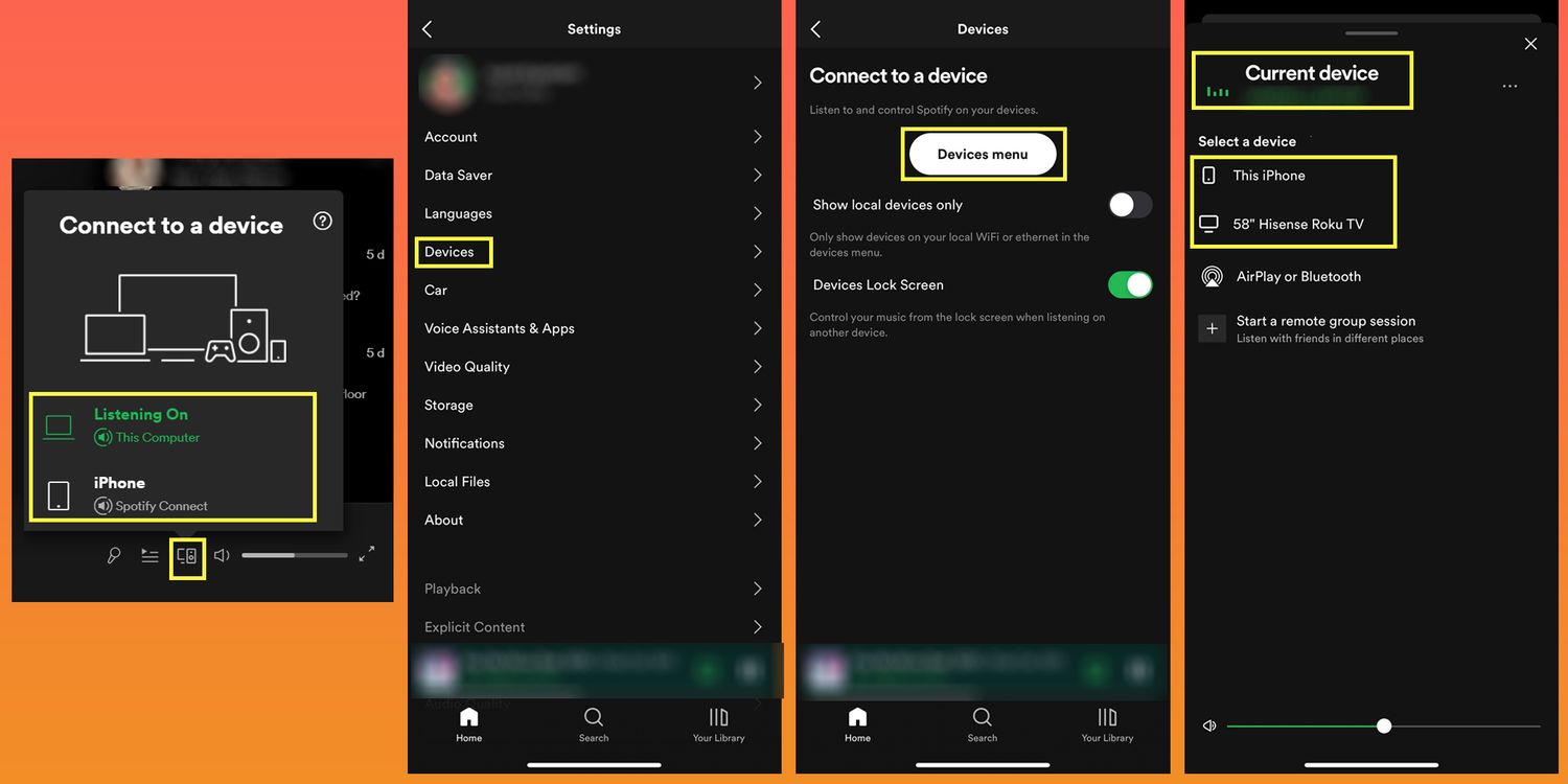 Para verificar en un dispositivo móvil, inicie la aplicación Spotify, toque Configuración (icono de engranaje) y vaya a ‘Dispositivos.’ Bajo ‘Conectarse a un dispositivo,’ golpea el ‘Menú de dispositivos‘ botón. El dispositivo que se está utilizando actualmente para reproducir pistas de Spotify debe aparecer en la parte superior. Otros dispositivos a los que se puede conectar (normalmente aquellos que están conectados a la misma red Wi-Fi) también aparecerán en la lista. Si se incluye un dispositivo irreconocible en la lista, existe la posibilidad de que alguien esté aprovechando la cuenta de Spotify.
