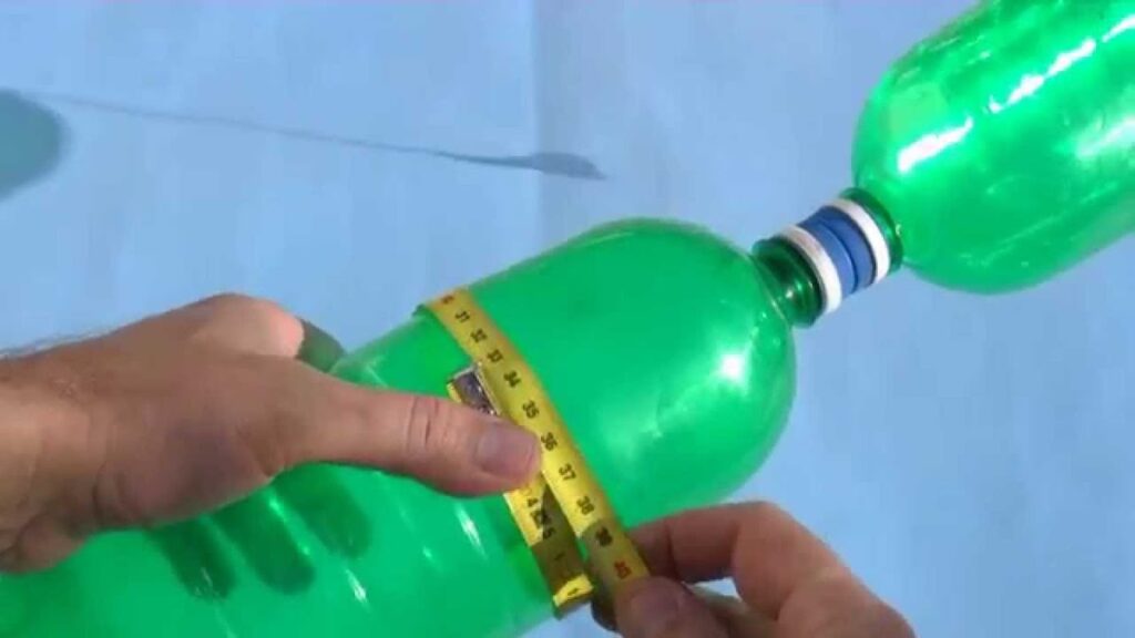 La idea es muy parecida a la de un refresco cuando se agita, pero utilizando esa propulsión. Cogemos la botella y la llenamos de agua. El tapón es preferible que sea de corcho, ya que la rosca puede no dar resultado. Al tapón le hacemos un agujero por el que pasar la boquilla del inflador. Para esto es muy útil tomar la medida de la aguja que se usa para hinchar un balón.