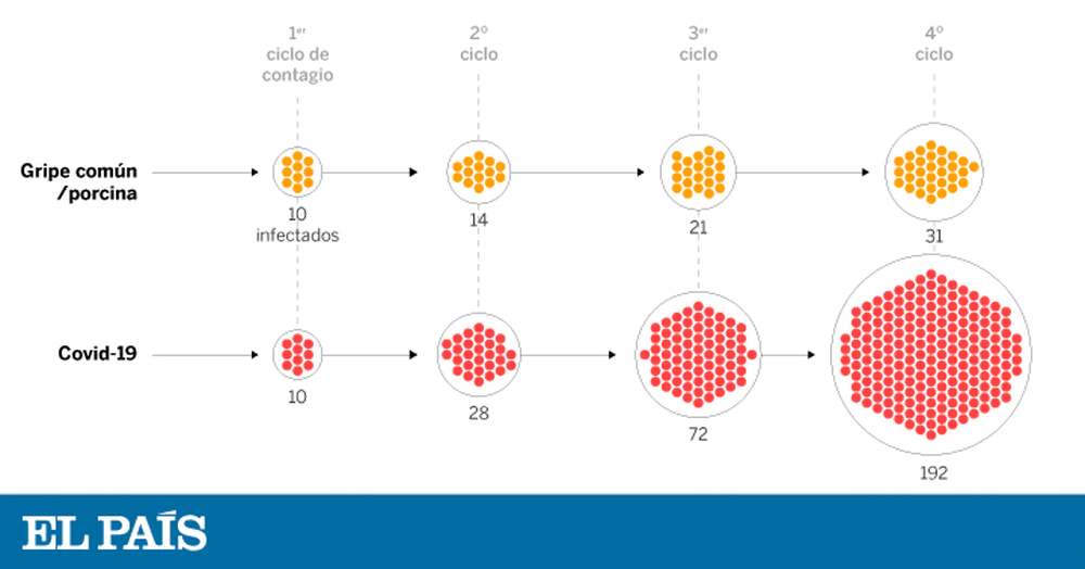 El nuevo virus parece capaz de infectar a millones de personas. La gripe común, con su número reproductivo de 1,3, causó el año pasado 20 o 30 millones de enfermos en EEUU, según los Centros para el Control y Prevención de Enfermedades (CDC), lo que supone el 7% de la población. En España, contando solo casos leves en atención primaria, el sistema de vigilancia de la gripe estima medio millón de contagios. Su crecimiento tiene potencial para ser rapidísimo. Si partimos de 20 enfermos de cada enfermedad y asumimos un ciclo de contagios de siete días, pasadas 12 semanas habría 466 infectados de gripe común y más de 30.000 de Covid-19.