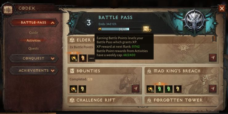 Los jugadores deben asegurarse de completar los objetivos de las actividades antes de que termine la semana para obtener la máxima cantidad de puntos de batalla posibles para esa semana. Pueden verificar esto haciendo clic en el Codex. Desde allí, navegue hasta diablo inmortal Menú del Pase de batalla. Los jugadores pueden elegir entre Guía, Actividades y Misiones. La guía actúa como un tutorial, por lo que los jugadores los obtienen simplemente jugando. Las actividades incluyen completar recompensas o grietas, que es familiar para diablo 3 jugadores Las actividades son donde los jugadores están limitados en la cantidad de puntos de batalla que pueden ganar. Los jugadores también pueden verificar cuántos ganaron durante la semana en esta pantalla.