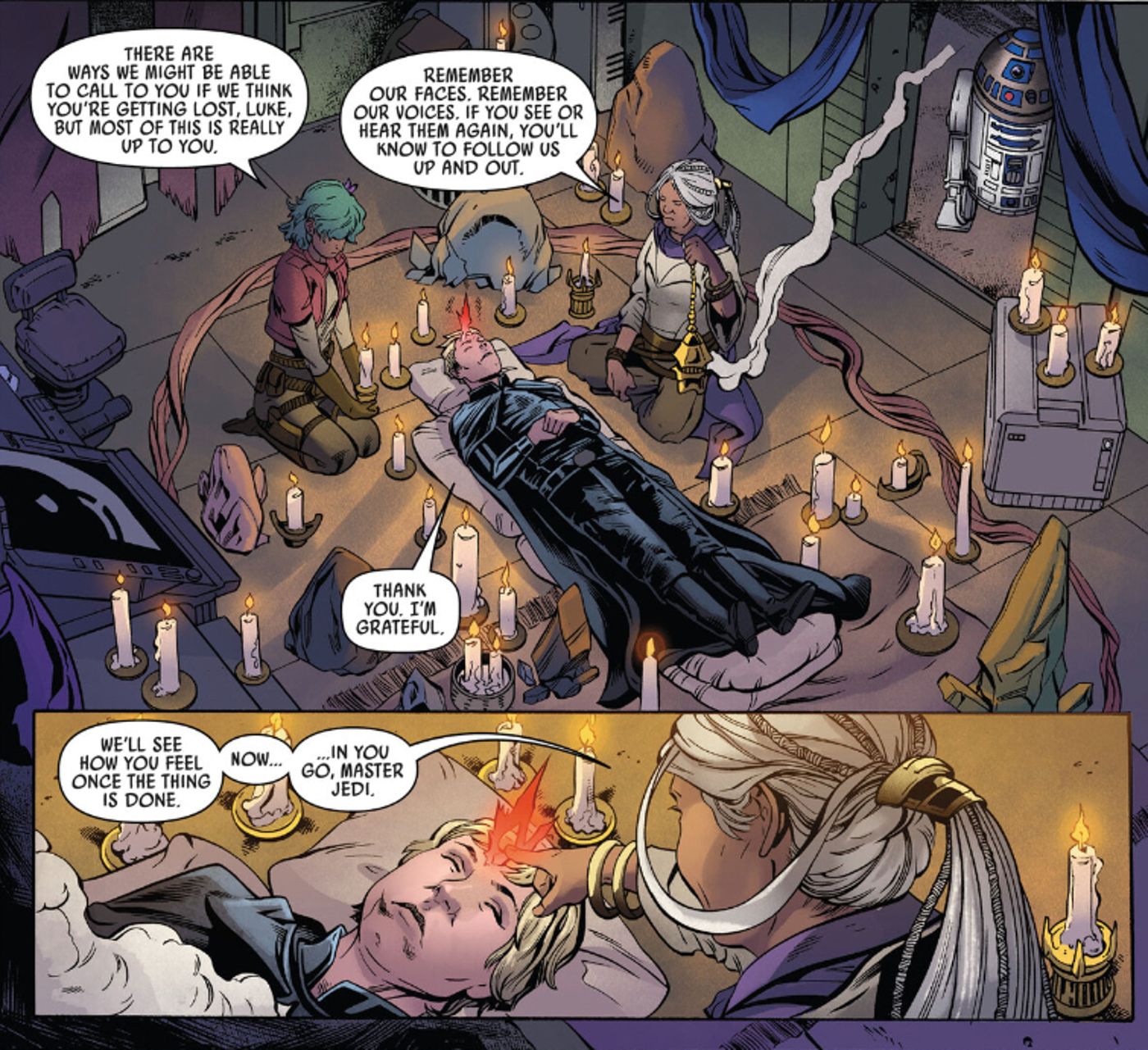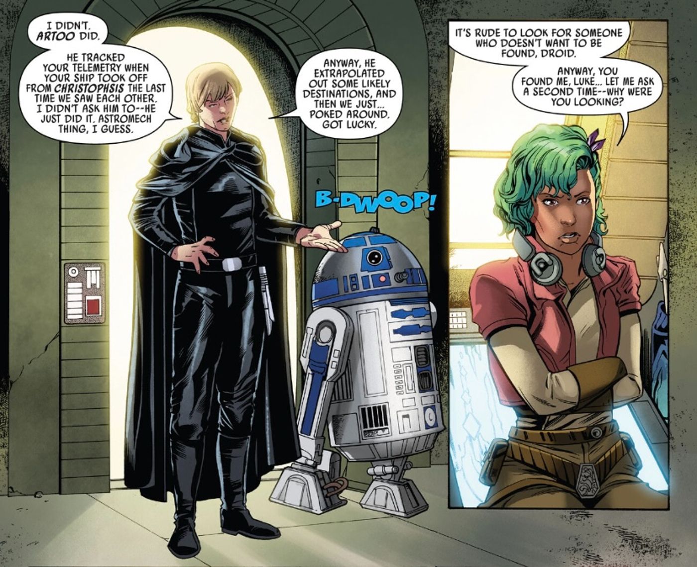 Guerra de las Galaxias El número 42, escrito por Charles Soule, con arte de Steve Cummings, tinta de Jonas Trindade y Wayne Faucher, color de Rachelle Rosenberg y letras de Clayton Cowles, comienza cuando Luke Skywalker encuentra a Fallanassi Gretta en la casa de su tía Feez. Aunque para los no iniciados, Luke podría parecer un maestro rastreador, de hecho, tiene una gran ventaja: R2-D2.